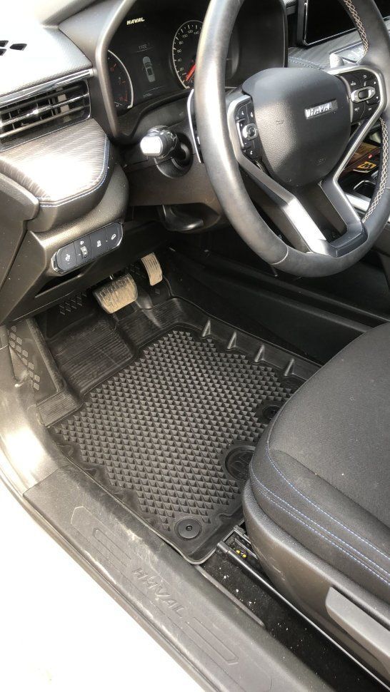 Ковры Delform EVS-2202 сделаны для Haval Jolion с передним приводом. Эти ковры похожи на привычные EVA ковры чёрного цвета с бортами, но сделаны из тяжёлого, плотного полиуретана. Их ячейки крупнее и глубже привычных, поэтому задерживают больше воды и легче моются. Ковры очень точно отформованы и идеально повторяют каждый изгиб пола. Чётко ложатся в штатные крепежи. Коврик водителя полностью закрывает место под левую ногу и уходит глубоко под педали. Ковры очень прочные и не нуждаются в подпятнике. Протереть их почти невозможно. Не имеют запаха и не твердеют на морозе.