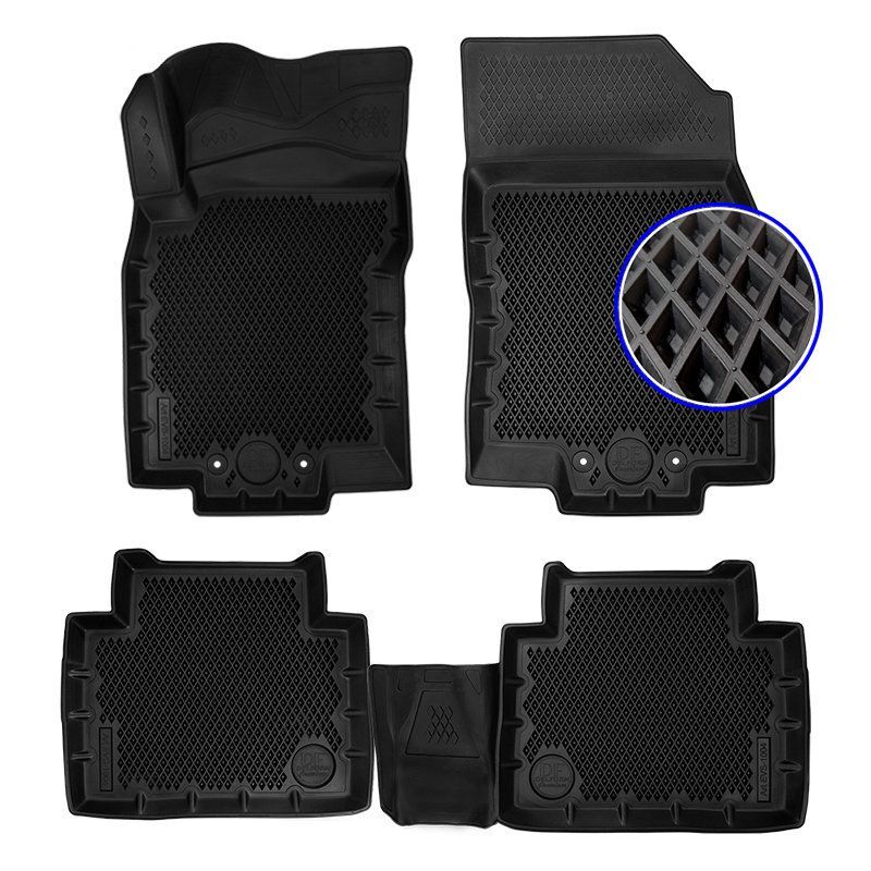 Ковры Delform EVS-1004 сделаны для X-Trail T32. Эти ковры похожи на привычные EVA ковры чёрного цвета с бортами, но сделаны из тяжёлого, плотного полиуретана. Их ячейки крупнее и глубже привычных, поэтому задерживают больше воды и легче моются. Очень точно отформованы и идеально повторяют каждый изгиб пола. Чётко ложатся в штатные крепежи. Коврик водителя глубоко уходит под педали и отлично облегает и закрывает место под левую ногу. Задние ковры с оптимально высокими бортами и занижением в передней части под обдув ног задних пассажиров. Этим коврам не нужен подпятник, т.к. протереть их почти невозможно. Не имеют запаха и не дубеют на морозе.