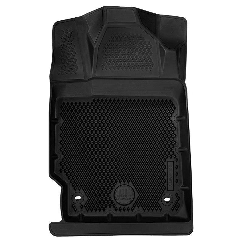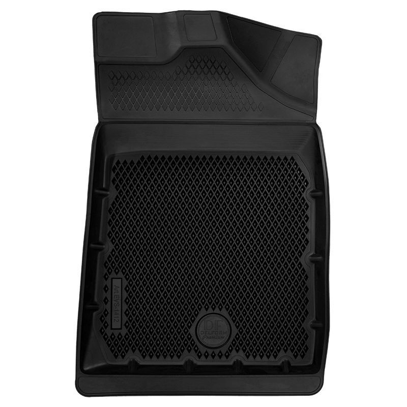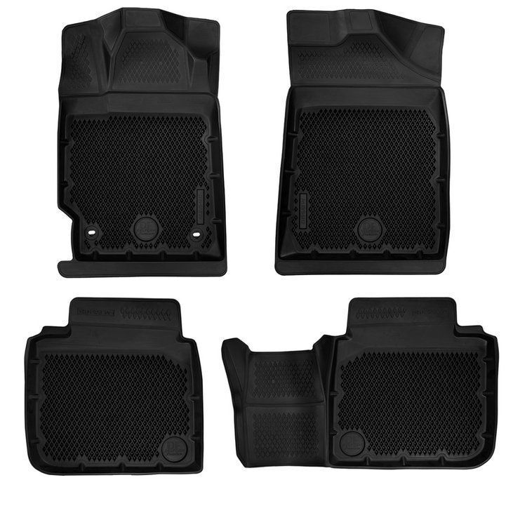 Ковры Delform EVS-1412 сделаны для Camry XV40. Эти ковры похожи на привычные EVA ковры чёрного цвета с бортами, но сделаны из тяжёлого, плотного полиуретана. Их ячейки крупнее и глубже привычных, поэтому задерживают больше воды и легче моются. Ковры очень точно отформованы и идеально повторяют каждый изгиб пола. Чётко ложатся в штатные крепежи. Коврик водителя уходит глубоко под педали и полностью закрывает место под левую ногу. Ковры не имеют запаха и не дубеют на морозе. Очень прочные и не нуждаются в подпятнике. Протереть их вряд ли получится.