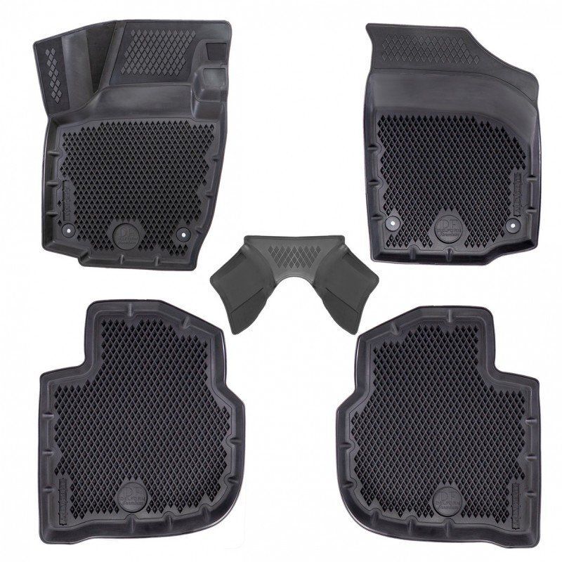 Ковры Delform EVS-1303 сделаны для Polo 20+ в кузове лифтбек и Skoda Rapid 16+. Эти ковры похожи на привычные EVA ковры с бортами, но сделаны из тяжёлого, плотного полиуретана. Их ячейки глубже и крупнее привычных, поэтому задерживают больше воды и легче моются. Ковры очень точно отформованы и идеально повторяют каждый изгиб пола. Закрывают максимальное пространство на полу. Чётко ложатся в штатные крепежи. Коврик водителя отлично облегает место под левую ногу и выступ справа, у педали газа. Уходит глубоко под педали, что недоступно для классических EVA ковров. Перемычка на задний тоннель сделана отдельным элементом и тоже очень точно ложится. Вообще, по точности формы это, возможно, лучший комплект на рынке.
