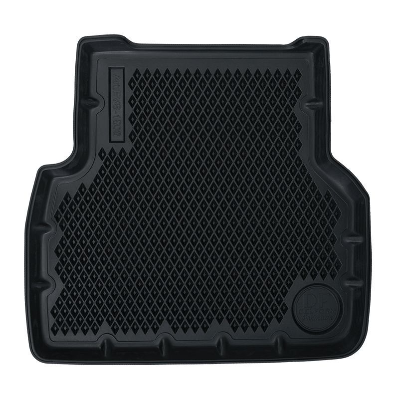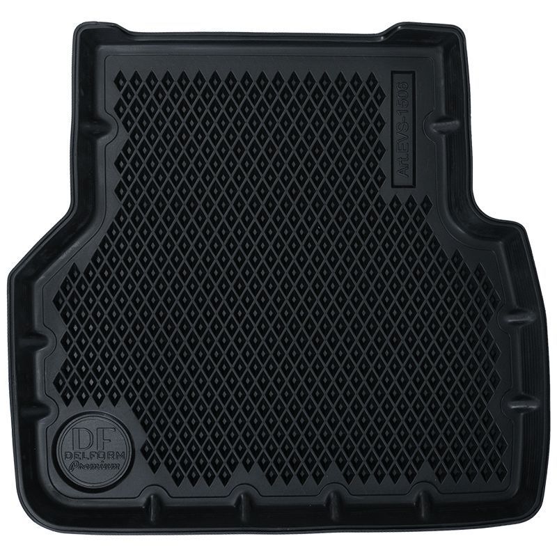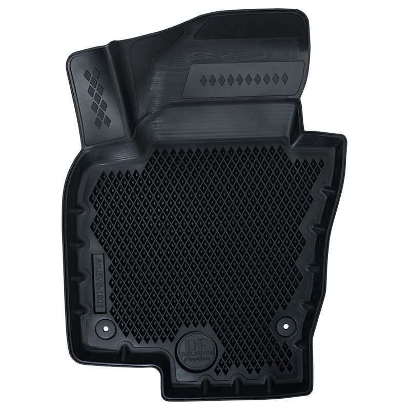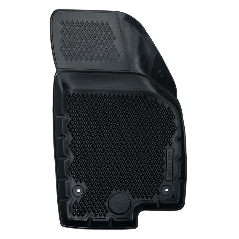 Ковры Delform EVS-1506 сделаны для Тигуана первого поколения. Эти ковры похожи на привычные EVA ковры чёрного цвета с бортами, но сделаны из тяжёлого, плотного полиуретана. Их ячейки крупнее и глубже привычных, поэтому задерживают больше воды и легче моются. Ковры очень точно отформованы и идеально повторяют каждый изгиб пола. Чётко ложатся в штатные крепежи. Коврик водителя полностью закрывает место под левую ногу и уходит глубоко под педали. Напольную педаль газа коврик облегает именно бортом, а не простым вырезом. Ковры очень прочные и не нуждаются в подпятнике. Протереть их вряд ли получится. Не имеют запаха и не дубеют на морозе.