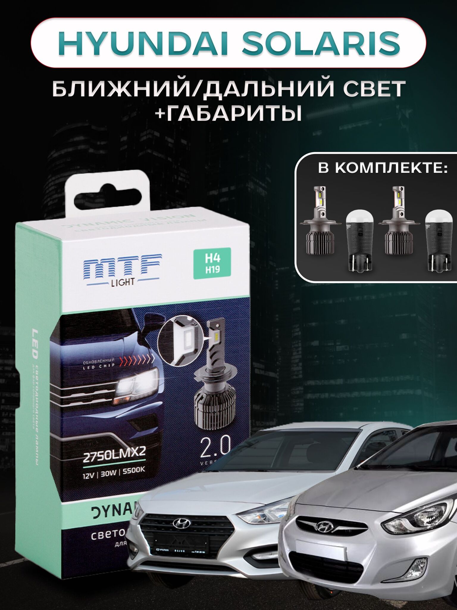 Лампы MTF Light Dynamic Vision H4/H19-одни из самых популярных диодных ламп взамен галогена. Конкретно данный набор предназначен для установки в Hyundai Solaris с рефлекторной оптикой (без линзы). Подходит для всех поколений автомобиля. Также подойдут для: Hyundai Creta, Kia Rio 2011+/Rio X-Line 2017+, ВАЗ 2113-15, Газель/ГАЗон NEXT и др. В комплекте Вы получаете лампы ближнего/дальнего света и габаритные лампы, которые будут одного цвета с основным светом. Таким образом получается полный комплект головного света.