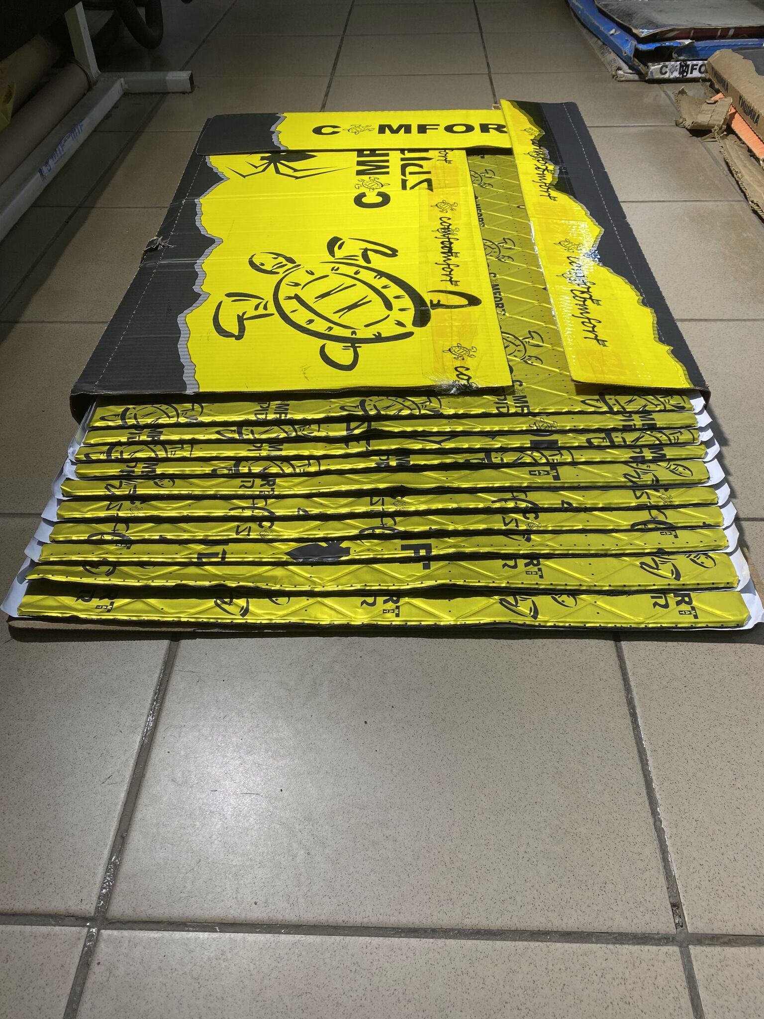 У материала матовая золотистая фольга с улучшенной адгезией для второго слоя изоляции. Основная область применения: пол, багажник, двери. Материал абсолютно не боится воды и очень хорошо держится на металле. Адгезия материала 14-16 Н/см является практически рекордной на рынке, особенно если учитывать, что Comfortmat замеряет адгезию на окрашенном металле.