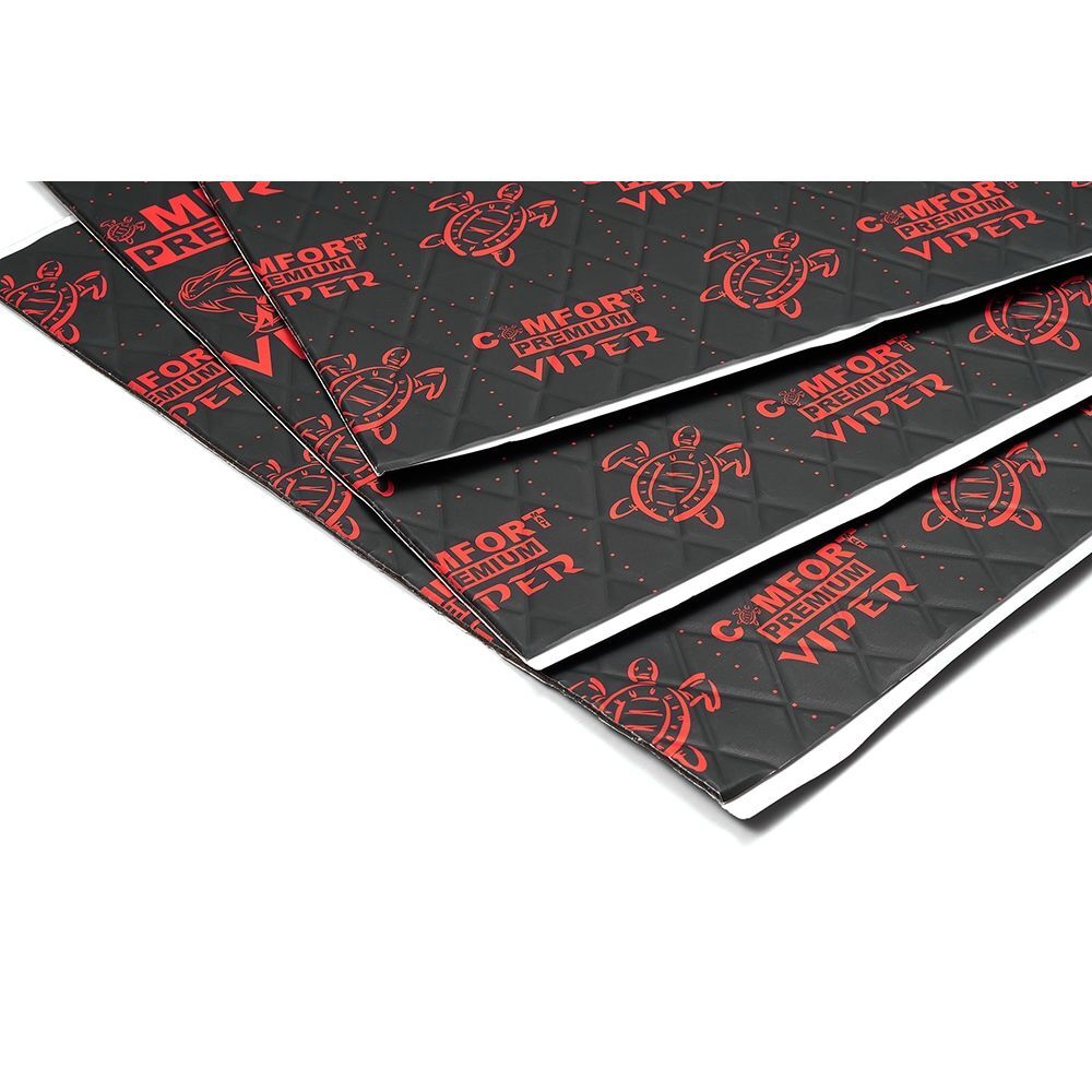 Comfortmat Viper-это облегчённая виброизоляция толщиной 3мм. Такой материал весит как "двойка", а работает как "тройка". Применяется там, где стоит задача уложиться в минимальный вес. Viper пришёл на смену материалам D3 и D4. Теперь фольга стала прочнее и имеет матовое покрытие, на котором лучше держится второй слой шумоизоляции. Мастика тоже поменялась и теперь материал может применяться вместо более толстых материалов.